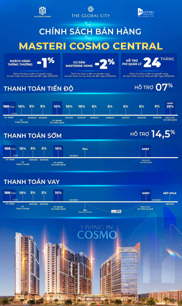 Tọa lạc ngay điểm giao thoa chiến lược, kế cận hệ tiện ích thương mại – giải trí – giao thương sôi động của khu đô thị quốc tế The Global City, Masteri Cosmo Central giúp cư dân kết nối mọi trải nghiệm nội khu chỉ trong 5 phút.